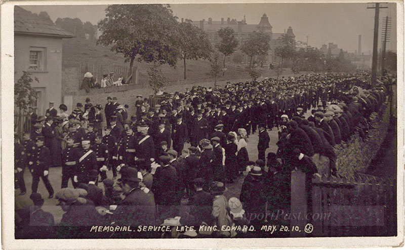 There were memorial services in about fifteen of the churches at Newport. First, there was a great united gathering at the Cattle Market, where a short service was conducted by the Rev. A. A. Mathews (vicar of St. Paul's) and the Rev. T, Richards (pastor of the Tabernacle Congregational Church). It was a semi-military, semi-civic service. The Royal Field Artillery from the barracks, under Colonel Biddulph, the 4th Welsh Brigade Territorial Artillery, under Colonel D. Ellis Williams, the Headquarter Companies (A, B, C, and D.) of the 1st Battalion Monmouthshire Regiment, under Major Harold Berthan, the Boys' Brigade, under Mr. C, G. Williams, president, Church Lads' Brigade and Church Naval Brigade, under Captains J. V. Allen and J. Barnes Fraser, 40 veterans (wearing 80 medals). Boy Scouts, and the Newport Corps of the St, John Ambulance Brigade, commanded by Chief Superintendent Hamilton, occupied positions on the sides of a large square in the open space fronting Ruperra-street. Into this square the civic procession passed - after parading from the Town hall. It was led by the Post-office band, and was composed of mounted police, under Head-constable Sinclair, foot police (with crepe bands on left arm), under Superintendent Brooks, fire brigade, under Captain H. S. Lyne. Poor-law guardians, the ex-president (Mr. W. L. Goldsworthy) and secretary of the Chamber of Commerce, the vice-president (Mr. J Davidson) and secretary of the Trades Council, public officials, Pilotage Commissioners with their clerk, Mr. E. J. Summers, Harbour Commissioners, with the chairman (Mr. John Macaulay), the clerk (Mr. A. J. Phillips), and the harbour master (Captain Pugsley), the free library committee (with the librarian, Mr. Matthews), the Consular body, magistrates with their clerk (Mr. T. Summers), the mayor (Mr. W. M. Blackburn), town-clerk (Mr. A A. Newman), the ex-mayor (Mr. Graham White), the postmaster (Mr. F. W. Southern), and a large muster of the indoor and outdoor postal and telegraph staff, Mr. H. Longstaff (secretary to the Newport Conservative Association). Mr. J. P. Elms (secretary to the Newport Ratepayers' Association), Mr. W. Bush (art master), Mr. J. Stewart (head of the technical institute), and many others. The maces carried in front of the mayor were covered with crepe.